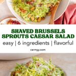 This shaved brussels sprouts caesar salad is a fun and delicious twist on a classic caesar salad. Shaved brussels sprouts tossed in lemon juice and a creamy caesar dressing, then topped with crispy croutons, bacon, and parmesan, this caesar salad with brussels sprouts is the perfect side dish for any occasion, from weeknight dinners to holiday gatherings to potlucks!